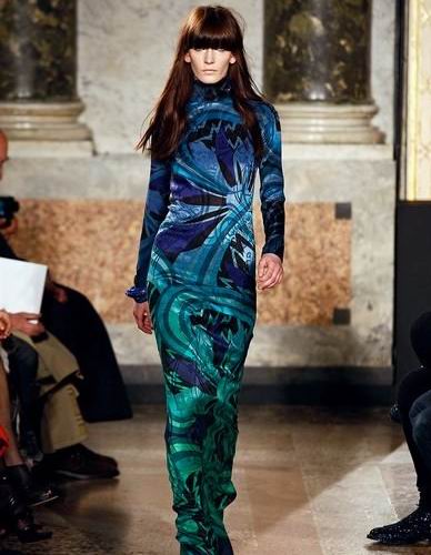 今季Pucci的首本印花以維也納分離派藝術名家如Klimt以及東方神韻為本,深沉的墨黑、夜藍、深綠、深紫、淺紫及漆紅等寶石色調加上煙熏鴉片色彩,拼湊出迭進的層次效果;染色絲絨、織花布料、古董和服圖案雪紡、金色蕾絲等質感紛陣,為秋冬女裝加添悅目光華。