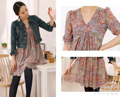 印花裙搭外套 穿出不同“味”美人 雪紡印花裙+牛仔短外套