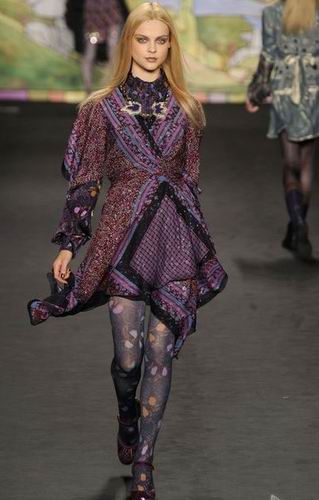 Anna Sui2010秋冬女裝系列絢麗登場了。依舊是繽紛的民族印花當?shù),在其中融入更帥氣利落的墊肩軍裝風格和冷眼朋克元素。大膽的印花運用和提花絲襪,向世人宣布2010的時尚界終將還是花團錦簇。