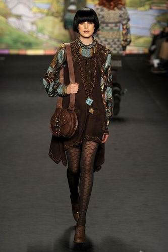 每季,Anna Sui總是帶來一些風格強烈的印染、絲綢亞麻和極具裝飾效果的織物。這些裝飾元素給她的作品增添了無與倫比的豐富性。2010秋冬系列Anna Sui女裝也不會讓觀眾失望。在2010秋冬系列Anna Sui女裝的秀場上,從印有彩繪玻璃圖案的印花裙、金色紅石榴圖案設(shè)計的大提花夾克到炫麗的印花絲襪都讓追隨者們看得眼花繚亂。
