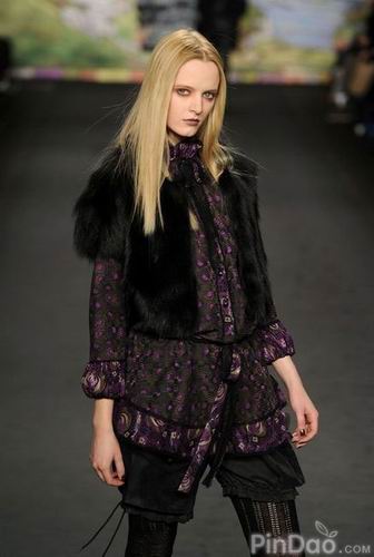 如果說單從這些帶有濃郁復古風格的衣服就將本季的風格定義為古著式看點,或許是不太恰當?shù)摹τ?010秋冬季Anna Sui作品秀的整體印象應(yīng)該是稀奇古怪的反回歸。不用矛盾,不用懷疑,這就是Anna Sui!受奇才Steven Meisel的影響,她知道如何恰如其分地搞怪。平底靴,寬大紐花毛衫,又或者是軟毛皮無鈕女短上衣都讓這種嬉皮公主的形象更實際。同時,那些不被提及的,未能得到相應(yīng)評價的幕后工作者們,現(xiàn)在正是時候來把功勞分給他們了。Pat McGrath的精美妝容, Garren的漂亮發(fā)型和 Frederic Sanchez的音樂。在將來的某個時候,這些元素都將會是最精彩的紐約被低估的設(shè)計者博物展會上不可或缺的一部分。