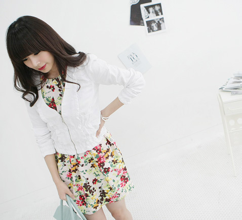 與充滿著迷幻效果的小花圖案的連衣裙搭配,外搭的薄衫最好是單色的,這樣才能調(diào)和過(guò)于令人眼花繚亂的圖紋;用小花圖案小裙搭配純色的帶帽衫,會(huì)讓浪漫的藝術(shù)氣質(zhì)流露出迷人,顯得個(gè)性十足。