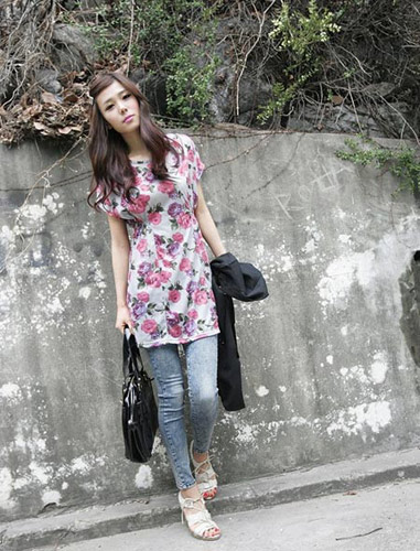 時(shí)尚點(diǎn)評(píng):在白色的T恤上加一層半透明的黑色印花紗質(zhì),獨(dú)特的印花設(shè)計(jì)與眾不同,顏色素雅的小碎花圖案,輕松又不失優(yōu)雅,搭配牛仔短裙和性感的黑絲襪,休閑而彰顯身份和時(shí)尚品味。