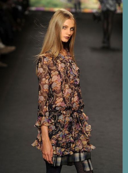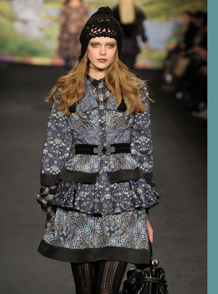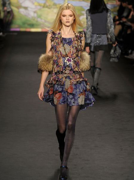 每季,AnnaSui總是帶來一些風(fēng)格強(qiáng)烈的印染、絲綢亞麻和極具裝飾效果的織物。這些裝飾元素給她的作品增添了無與倫比的豐富性。2010秋冬系列AnnaSui女裝也不會(huì)讓觀眾失望。在2010秋冬系列AnnaSui女裝的秀場上,從印有彩繪玻璃圖案的印花裙、金色紅石榴圖案設(shè)計(jì)的大提花夾克到炫麗的印花絲襪都讓追隨者們看得眼花繚亂。