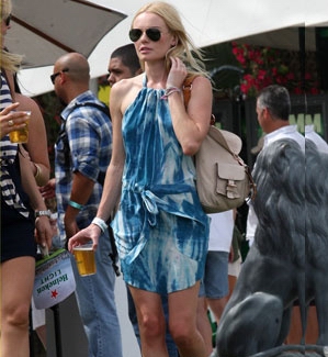 Kate Bosworth的連衣裙采用了藍(lán)色扎染的圖案清爽自然,腰間的系帶設(shè)計隨意中帶有裝飾效果。
