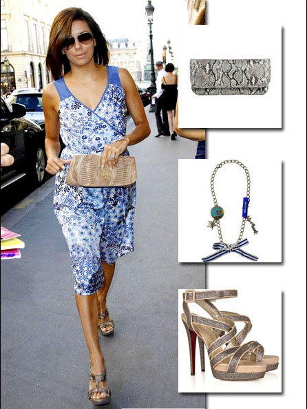 搭配建議:藍(lán)色碎花連衣裙,清新自然,簡(jiǎn)約的款式好似夏日里的一陣涼風(fēng)!動(dòng)物皮手包呼應(yīng)金屬絲高跟鞋搭配的恰到好處!
