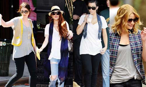 像Michelle Trachtenberg的亮色馬甲(或者是外套、針織衫等),Lindsay Lohan飄逸的扎染絲巾和破洞牛仔,Kim Kardashian的牛仔短馬甲,和Emilie de Ravin的格仔襯衫,都是簡單又隨性的休閑風搭配,如果你想在夏日里呈現(xiàn)隨意瀟灑的度假風格,用Tee這件百搭單品也可以輕易穿出。