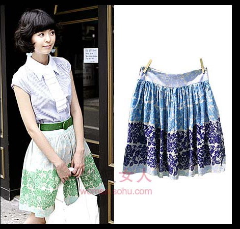 時尚解析:柔和的顏色是這套裝扮的搭配重點,上衣的藍色與裙子的圖案上下呼應,統(tǒng)一的協(xié)調感看上去非常協(xié)調。