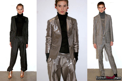09秋冬,時尚重歸單純,建筑感成為輪廓的關(guān)鍵詞,這一切把套裝又帶回我們眼前。對單純或者建筑感的追求使設(shè)計師回歸了經(jīng)典的西裝剪裁技術(shù);單純的心境也摒棄了長久以來Bling Bling的風(fēng)格,轉(zhuǎn)而以低調(diào)的態(tài)度追逐產(chǎn)品本身的內(nèi)涵。于是剪裁考究、肩部造型強(qiáng)壯,具有80年代感的長褲套裝是最具趨勢性的回歸。如果說需要一些變化的話就是關(guān)于銳角肩部造型的上裝與流動的寬腿褲和香煙褲或緊身褲的變化。當(dāng)然套裝考究的剪裁沒錯,但對于女人來說,打造一個"看起來毫不費力的造型"(Effortless Style)更重要。這方面的大師級典范可以參照Kris Van Assche,Dior Homme的設(shè)計總監(jiān)可不是玩的,人家就能把好好的套裝硬給弄擰巴了,寬腿褲偏要穿得皺皺巴巴,配上雙極富女性味的短靴,楞是在80年代的都市感中混入了一些街頭的不羈感或搖滾元素,那叫一個"型"。