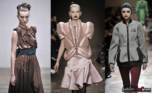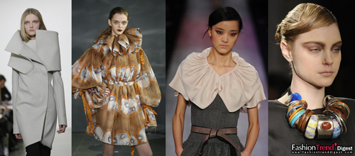 這是一個"大"即美的季節(jié)。無論是象山似的輪廓,披肩般的領(lǐng)子,或鐐銬樣的手鐲。在諸多元素中,領(lǐng)子成為設(shè)計師最好把玩的部分,因為這很容易成為新的視覺重點。煙囪領(lǐng)或者撐開的雕塑效果都是具有趨勢的,而最好玩的當(dāng)數(shù)褶飾領(lǐng),來自法國啞劇中的小丑著裝靈感,圓圓的褶皺如立體花朵一般矗立著,把個臉蛋襯托得象只碩大的花芯。層疊或超大的效果如披肩一般,一種具有幽默意味的新浪漫主義風(fēng)格由此產(chǎn)生。項鏈也不再是傳統(tǒng)意義上的項鏈,一切以項圈或像"Cuffs"的形式出現(xiàn)。無論是石頭的、金屬或者塑料的,碩大與重量感成為其衡量標(biāo)準(zhǔn)。總之,套用一句電影臺詞,這個季節(jié),"只買大的,不選對的。"