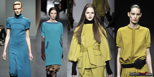 簡約的回歸總是伴隨著著色彩單純而濃郁的發(fā)展方向,這就好比蒙得里安的繪畫。一些明亮飽和的色調(diào)如橘(橙)色系、孔雀綠、芥末黃以及各種粉色滲透著這個季節(jié),與黑色、咖啡色、駝色等一些基本色很好地結(jié)合。其中最有商業(yè)價值的或許是延續(xù)了兩季的孔雀綠和芥末黃,都帶有些精妙的復(fù)古感。當(dāng)然變化是有的,孔雀綠中帶有了一些翠鳥藍(lán)的成分,適合連衣裙和針織;芥末調(diào)則具有一些水洗感,為黑色或灰色增加一種明亮的調(diào)子。其適用于所有的產(chǎn)品領(lǐng)域,從外套到針織到連衣裙?兹杆{(lán)和芥末黃共同構(gòu)成了秋冬濃郁的調(diào)色板上重要的一抹。