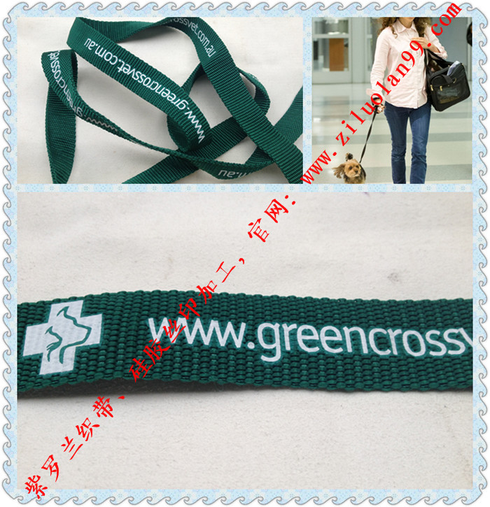 美國greencross vets在東莞紫羅蘭服裝輔料有限公司定制寵物牽引帶用的膠槳絲印織帶,具有如下特性: