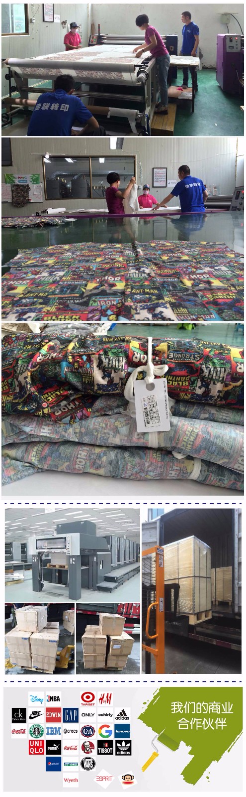 常熟市佳聯(lián)印花科技有限公司是一家專業(yè)從事高速數(shù)碼印花、轉(zhuǎn)移印花、熱轉(zhuǎn)印、轉(zhuǎn)印燙畫、服裝轉(zhuǎn)印、壓燙,從設(shè)計(jì)、制作、印刷、壓燙一整套紡織品印花解決方案,支持定位裁片印花、匹布印花滿足所有客戶的需要。工藝在服裝(T恤,背心,連帽衫,連衣裙,羽絨服等)、箱包(購(gòu)物袋、手提包、筆袋、冰包)、家紡(抱枕、地墊、冰絲席、被套等)、潛水料(杯套、餐包、電腦包等)、玩具、禮品、藝術(shù)品等產(chǎn)品上應(yīng)用非常的廣泛。佳聯(lián)印花科技有限公司提供高速數(shù)碼熱升華,熱轉(zhuǎn)印加工服務(wù),具有耐水洗、色牢度好、層次感強(qiáng)、色彩鮮艷亮麗、綠色環(huán)保等特點(diǎn)。公司引進(jìn)德國(guó)進(jìn)口高速印花設(shè)備,無(wú)版費(fèi),全彩印,無(wú)套色限制,每小時(shí)時(shí)速5000平方米,并擁有多臺(tái)1.8門幅數(shù)碼熱升華噴繪機(jī),配合多臺(tái)滾筒、平板轉(zhuǎn)印設(shè)備,為客戶在價(jià)格、交期、質(zhì)量等方面得到有效的保證。