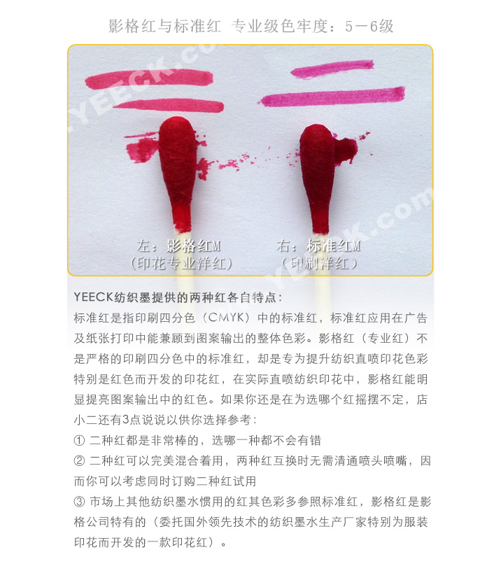 (省墨帶來的好處:YEECK紡織墨水色彩超濃艷,較低噴墨量就能出好色彩,加上真正好質(zhì)量帶來的少浪費(fèi)墨,讓同樣100ml YEECK 墨水,實(shí)際印花數(shù)量可能多出1倍或以上),這樣是不是就可以有:品質(zhì)印花,單件印花成本卻更低 (與用低廉的墨水相比)。