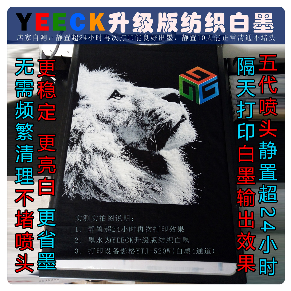 相比市場(chǎng)其他紡織墨水,使用色彩濃烈的YEECK 紡織墨水,不僅僅是色牢度提升幾個(gè)等級(jí),色彩更鮮亮,多印50%以上數(shù)量的衣服,噴頭使用壽命長(zhǎng)N倍一點(diǎn)也不意外。YEECK紡織墨水——您就偷著樂吧!