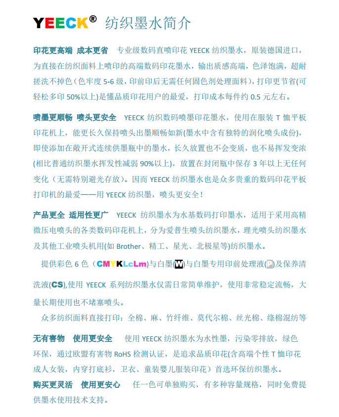 YEECK品牌紡織印花墨水 原裝進(jìn)口六色數(shù)碼印花墨水 更多優(yōu)點(diǎn)