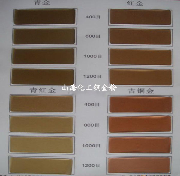 1000目銅金粉:用于制造光亮度高的噴霧膠漆、木制材料、絲印油墨及橡皮凸板油墨。特點:精細(xì),光亮度高。