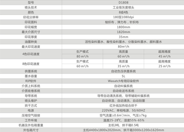 D1808導(dǎo)帶式紡織數(shù)碼噴墨印花機(jī),具有自動(dòng)刮墨、自動(dòng)保濕和自動(dòng)糾偏功能等近20項(xiàng)自主創(chuàng)新的專利技術(shù),產(chǎn)品大氣美觀、加工細(xì)膩。打印幅寬1800mm。最大分辨率可以達(dá)到1000dpi,具有720×200 dpi, 720×400 dpi, 720×600 dpi, 720×800 dpi, 720×1000 dpi五種工作模式,生產(chǎn)模式可以達(dá)到100平米/小時(shí)。是目前在此速度上,分辨率最高的數(shù)碼印花機(jī)。穩(wěn)定的供墨系統(tǒng),同時(shí)兼具8色和4色雙模式打印,使用專業(yè)的紡織印花Wasatch SoftRIP,使得色彩更具表現(xiàn)力。該機(jī)器配套有1800系列烘干箱,和10色活性墨水、8色酸性墨水,適合棉布、人造棉、麻、絲、羊毛及其混紡材料的染色和印花。