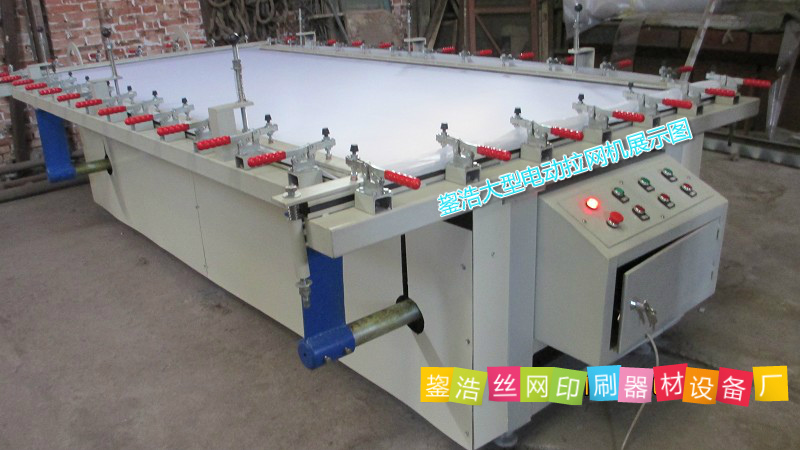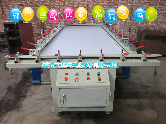 大型電動(dòng)繃網(wǎng)機(jī)是制作專業(yè)大型網(wǎng)版的必備機(jī)械,具有經(jīng)久耐用,省時(shí)省力等特點(diǎn)。適合絲網(wǎng)印刷的各個(gè)行業(yè),如玻璃廠,服裝廠,制版廠和廣告的大網(wǎng)版和批量網(wǎng)版的制作,操作簡單,制版張力高,一經(jīng)推出好評(píng)不斷。此大圖規(guī)格1800*3000mm,也可根據(jù)客戶的需求加工定制,歡迎各界朋友咨詢洽談!。