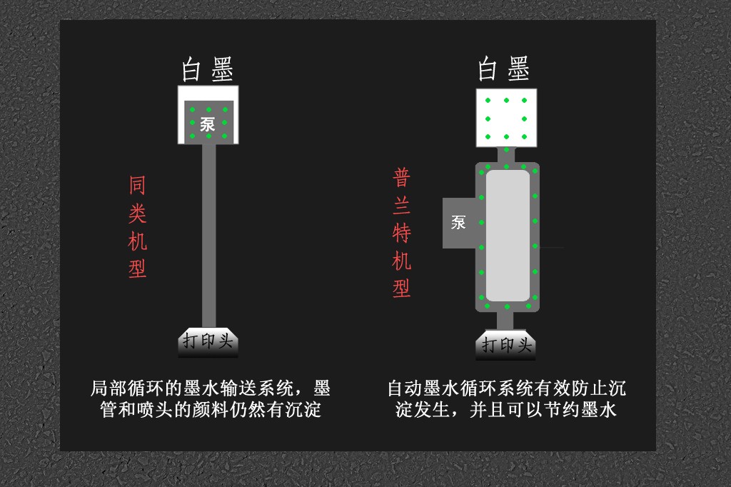 數(shù)碼印花機(jī)最大的核心易損部件就是噴頭,噴頭使用壽命長(zhǎng) 噴墨效果好 可以直接決定購(gòu)機(jī)者的利潤(rùn)和投資回報(bào),那么怎么才能在同樣的噴頭情況下,使噴頭壽命使用更久了,這樣就要在機(jī)器上面想辦法,如上圖,普蘭特的機(jī)器就是在機(jī)器上面想辦法,加了白墨循環(huán)系統(tǒng),在插電的情況下,4個(gè)小時(shí)自動(dòng)循環(huán)一次,讓白墨再墨管 墨管 隨著保濕器 機(jī)器的穩(wěn)定性更好這樣使噴頭的壽命更久,更耐用,更好用。