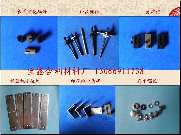 供應產(chǎn)品有:小圓碼仔、大小導軌、不銹鋼軌道、滑觸線、跑臺腳杯、T型鐵、不銹鋼上漿器、方碼仔、長圓印花碼仔、、鋁梅花碼仔、塑膠把手、塑膠塞、網(wǎng)針、網(wǎng)釘、馬車螺絲、堵塞、靠把、連接板、橢圓形印花機定位片等材料。可來樣加工定做,廠家直銷,歡迎來電咨詢洽談:宋女士 13302610438、13066911738