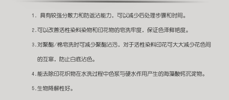推出高效、環(huán)保、節(jié)能、減排的綠色新型助劑、低消耗助劑,無磷、不含APEO、易生物降解的助劑,并致力于減少化學(xué)品使用。