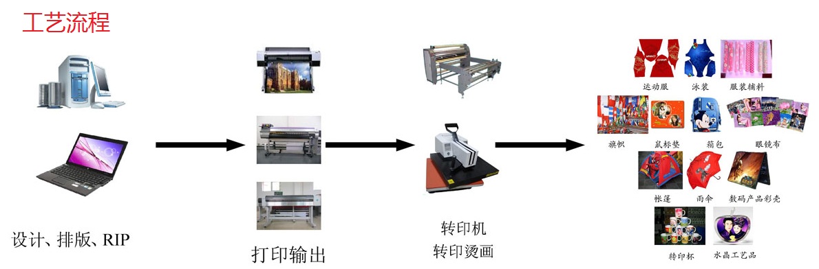 3、通過轉(zhuǎn)印機(jī) ,將轉(zhuǎn)印紙上的圖案轉(zhuǎn)印到承印物上。轉(zhuǎn)印溫度在180-220度,轉(zhuǎn)印時(shí)間在30-120秒,視承印介質(zhì)的種類,轉(zhuǎn)印溫度和時(shí)間有所區(qū)別。