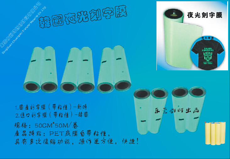 PET底膜上自帶粘性,特有的反粘功能,具有復貼和復原功能,在撕去不需要的部分時,對不小心揭去了應保留的部分,本材料底膜上有強力自粘耐高溫膠,可將不小心揭去的部分重新放置在原有的部位并重新粘貼在底膜上,可復貼功能是本公司生產(chǎn)的PU膜特有的)并恢復如初,這對刻比較小的圖案和文字具有非常重要的作用。韓國淺綠色夜光膜發(fā)光時間4小時,厚度合適不透底,手感舒服環(huán)保PU材料,PET底膜上自帶粘性,特有的反粘功能,在耐水洗,手感,拉了,發(fā)光時間都能夠滿足用戶的要求。