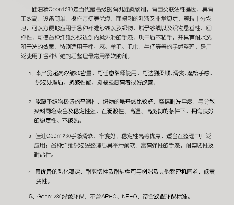 硅油精Goon1280浙江地區(qū)嘉宏紡織助劑硅油生產(chǎn)商