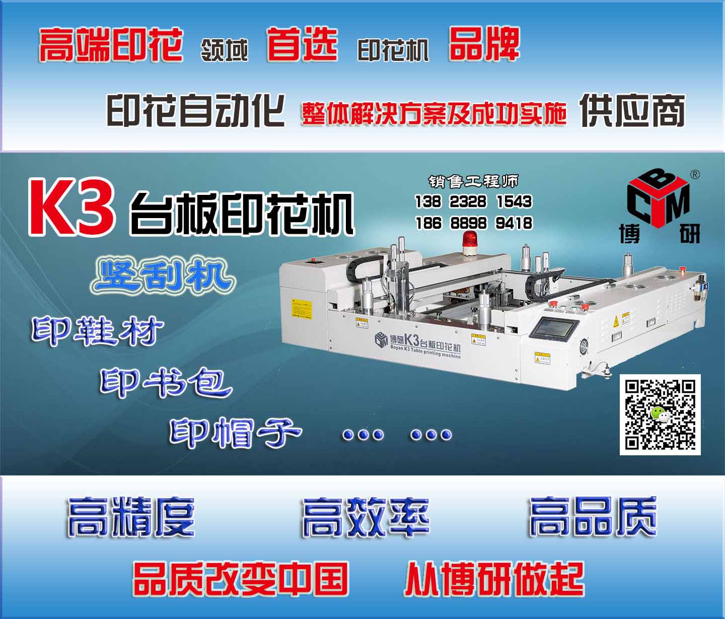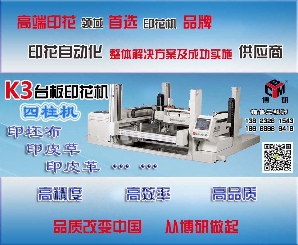 博研公司只做自主研發(fā)產(chǎn)品,我們能為企業(yè)提供的不只是產(chǎn)品,我們提供專業(yè)的解決方案,協(xié)助企業(yè)解決生產(chǎn)難題。深圳博研商用機(jī)械有限公司,07開始專注臺板自動印花機(jī)的研發(fā)設(shè)計(jì)與生產(chǎn),09年開始市場銷售。有針對性的技術(shù)研發(fā),完善的功能設(shè)計(jì),精準(zhǔn)件的生產(chǎn)制造,造就了成熟的K3臺板自動印花機(jī)。滿足了高科技底價(jià)位的自動印花機(jī)市場需求。博研公司感謝各新老客戶一路走來的支持與關(guān)愛,我們將兢兢業(yè)業(yè),精亦求精。 憑借其在自動化印花設(shè)備領(lǐng)域多年的積累和雄厚的技術(shù)研發(fā)實(shí)力,以安全性、穩(wěn)定性、前瞻性、適應(yīng)性為原則,逐步形成了為印花行業(yè)中、高端客戶提供產(chǎn)品研發(fā)、生產(chǎn)、銷售和服務(wù)的能力。博研K3系列臺板印花機(jī)適合裁片和匹裝兩大類承印物,對油墨和涂料的適應(yīng)范圍非常廣泛。K3已被成功應(yīng)用于服裝裁片印花、鞋材印花、箱包皮具印花、工藝品平面印花、文具印花、運(yùn)動器材 、織帶印花、薄膜花紙印花、人造絲花印花、雨傘太陽傘印花、廣告?zhèn)阌』ā徂D(zhuǎn)印紙印花、大幅面匹布接板印花等領(lǐng)域,銷往浙江、福建、四川、湖南、廣東等省區(qū)。博研自創(chuàng)立以來就專注于臺板自動印花機(jī)的創(chuàng)新研發(fā),致力于為印花廠商創(chuàng)造極具競爭力的綜合運(yùn)營平臺。公司擁有自主創(chuàng)新研發(fā)、精密制造臺板自動印花機(jī)及核心器件的能力,同時配套印花工藝開發(fā)出適合臺板印花工藝的配套設(shè)施,全方位提升印花廠商的經(jīng)營效益。