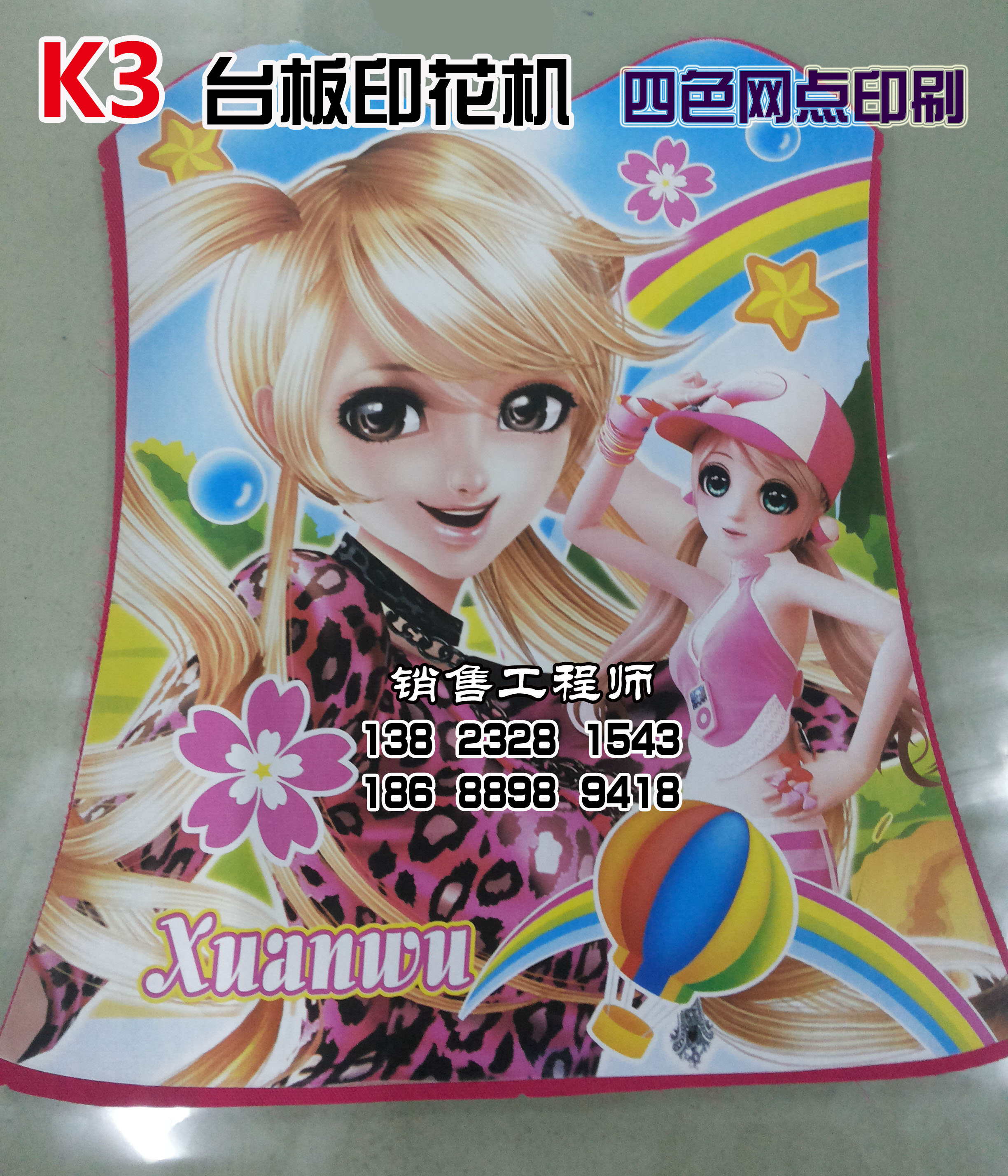 4.適用范圍廣:人工跑臺能印的工藝,K3臺板印花機(jī)同樣適合,且印得更好。