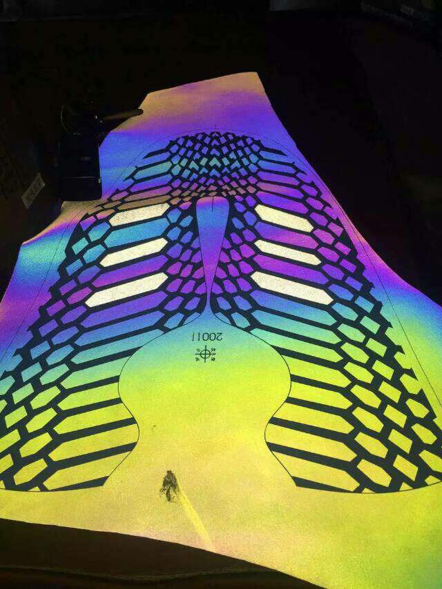 反光彩虹轉(zhuǎn)印膜又名反光七彩轉(zhuǎn)印膜、幻彩反光轉(zhuǎn)移膜、炫彩反光轉(zhuǎn)印膜、五透反光膜、透明五彩反光轉(zhuǎn)印膜、透明反光幻彩膜、透明彩虹反光膜是一種全新的、高科技轉(zhuǎn)移印花反光薄膜材料,通過一臺長達20多米的生產(chǎn)設(shè)備后,將一顆顆晶瑩透明的塑料粒子慢慢吸入,從另一端出來的就是一卷五彩繽紛的彩虹膜,它利用光的干涉原理,白光從外面進入薄膜,發(fā)生光的干涉作用,再反射出來,便產(chǎn)生出五顏六色的色彩。當對彩虹薄膜觀察角度改變或襯以不同的底色時,色澤也會起變化,創(chuàng)造出富有色彩、與眾不同的包裝反光效果,為產(chǎn)品包裝開辟了一個新的領(lǐng)域。結(jié)合彩虹膜與反光轉(zhuǎn)印膜的生產(chǎn)工藝;我們創(chuàng)造性的研發(fā)并生產(chǎn)出了反光幻彩轉(zhuǎn)印膜,此產(chǎn)品只需要印熱轉(zhuǎn)印油墨再印上熱熔膠即可得到奇特的幻彩反光效果,是商標行業(yè),服裝行業(yè),燙畫行業(yè),熱轉(zhuǎn)移印花行業(yè),服飾輔料行業(yè)必不可少的產(chǎn)品;也大大提高服裝檔次。驚奇的是整個生產(chǎn)過程不添加任何染料或印刷色料的情況下,保持膜本身的透明性和光彩奪目的視覺效果,是透明膜或添加色母或經(jīng)由印刷變成的彩色膜不可能達到的效果,此彩虹膜的成本遠遠低于鐳射膜,是反光彩色薄膜運用上的一大突破。
