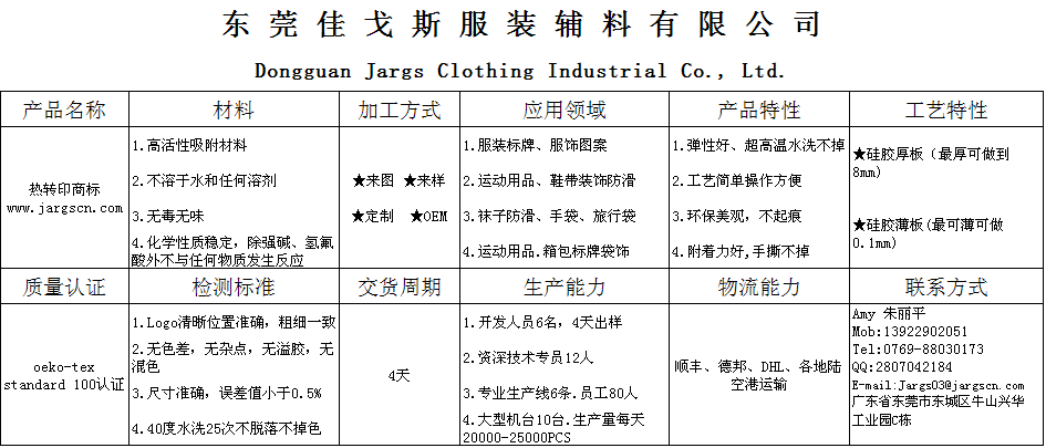 東莞市佳戈斯服飾實(shí)業(yè)有限公司是硅膠熱轉(zhuǎn)印3D標(biāo)牌、硅膠標(biāo)牌、硅膠燙畫(huà)、硅膠絲印薄版厚板、硅膠燙壓標(biāo)牌、內(nèi)衣滴硅膠涂層、織帶滴硅涂層、手套、手袋印花、矽利康標(biāo)牌、箱包標(biāo)牌等產(chǎn)品專(zhuān)業(yè)生產(chǎn)加工的公司,擁有完整、科學(xué)的質(zhì)量管理體系。東莞市佳戈斯服飾實(shí)業(yè)有限公司的誠(chéng)信、實(shí)力和產(chǎn)品質(zhì)量獲得業(yè)界的認(rèn)可。歡迎各界朋友蒞臨參觀、指導(dǎo)和業(yè)務(wù)洽談。