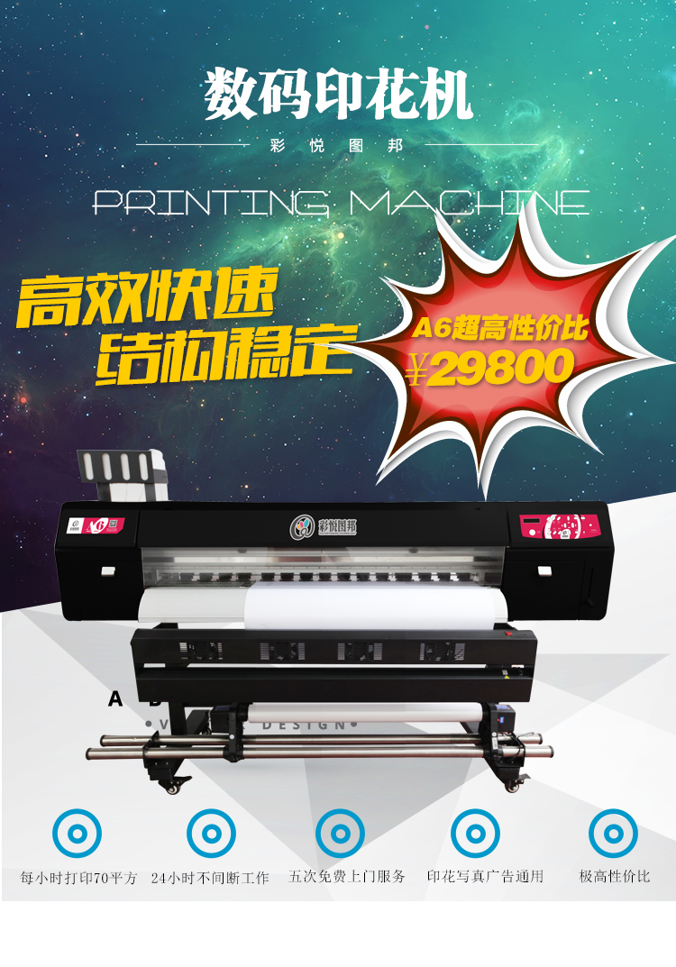 彩悅圖邦A(yù)6是一款性價(jià)比非常高的熱轉(zhuǎn)印、戶內(nèi)廣告通用的微壓電打印機(jī),實(shí)際輸出寬幅1.6米,既可以做熱轉(zhuǎn)印,又可以打市面上常見的戶內(nèi)材料,可謂是一機(jī)多用!性價(jià)比非常高