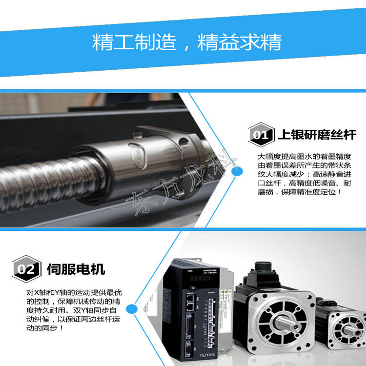 6 高精度雙絲桿----用進(jìn)口高精度研磨滾珠絲桿替代廣大廠家使用的同步帶,運行聲音小,精度高,耐磨損;直線導(dǎo)軌采用臺灣進(jìn)口HIWIN上銀品牌,品質(zhì)有保證。