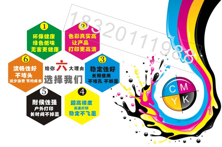 UV墨水顏料粒子平均直徑0.2-0.3微米,UV墨水品質(zhì)穩(wěn)定、UV墨水打印流暢、UV墨水顏色鮮艷、UV墨水固化徹底、UV墨水不含揮發(fā)性有機(jī)溶劑,低粘度,環(huán)保,無刺激性氣味,可確保墨水在噴射印刷過程中無堵塞噴頭現(xiàn)象。承印材料更加廣泛,支持更廣泛的圖像市場應(yīng)用。固化后的墨層柔韌性好,附著力佳,耐擦洗、耐溶劑、高光澤。