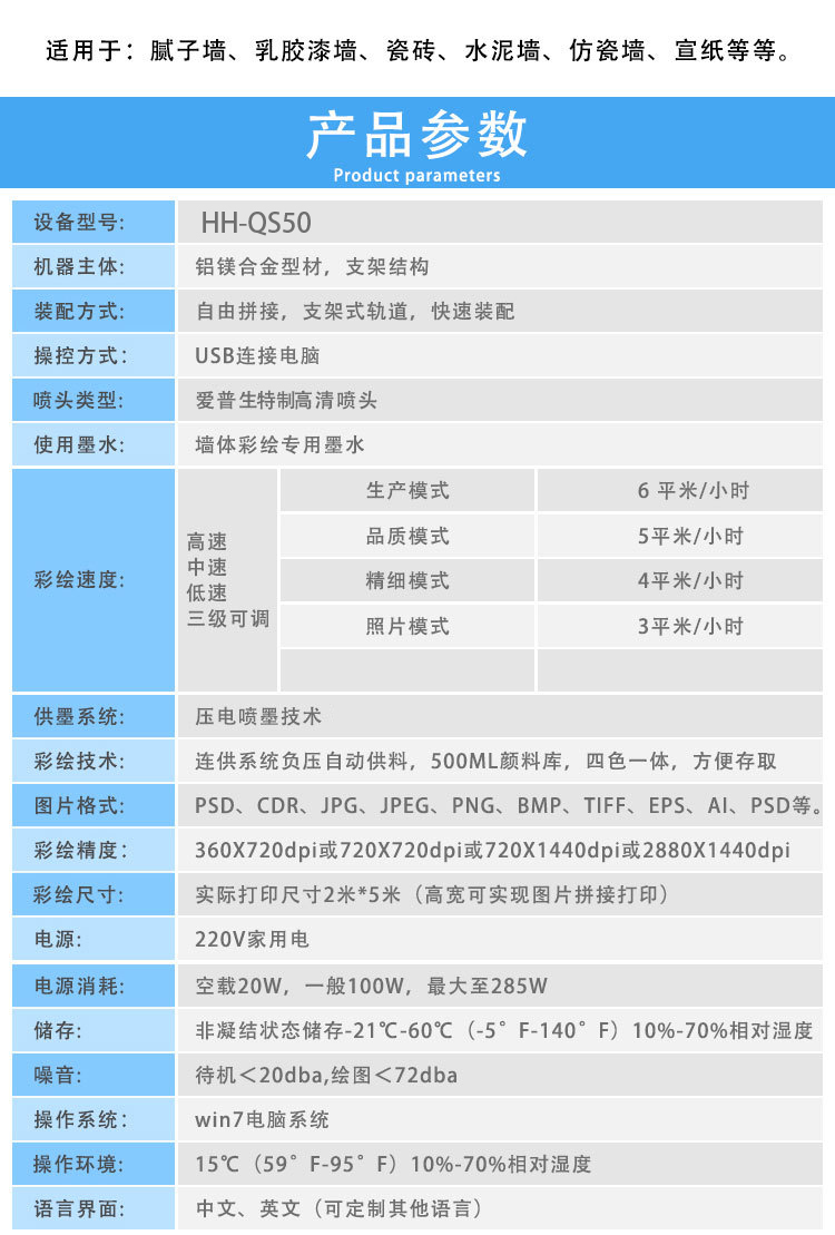 ①單噴頭墻體彩繪機(jī):單噴頭的墻體機(jī)普遍都是使用愛普生的七代頭,七代頭的售價(jià)一般為4000元到5000元(原裝正品)。而單噴頭墻體機(jī)每小時(shí)普通打印的效率大概為3到6個(gè)平方,高清打印的話每小時(shí)頂多3個(gè)平方。(英:(1) single head wall painting machine: the single head of the wall machine is generally the use of epson seven generation head, seven generation head price is generally 4000 yuan to 5000 yuan (original quality). While the efficiency of a single nozzle wall machine is about 3 to 6 square meters per hour, the maximum is 3 square meters per hour for hd printing.)