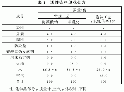 由表知,泡沫工藝處方中大量的水被空氣取代,完全不用火油。此外,在活性和分散染料印花漿中糊料用量也大為減少。