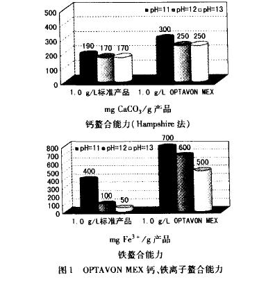 OPTASTEAM工藝中的核心組分。即使在高堿濃度下,OPTAVONMEX同樣具有很高的對堿土金屬和鐵離子的螯合能力。它可以有效地防止過氧化物漂白中催化劑的危害,以及處理浴中及織物上的沉降物/沉淀(見圖1)。