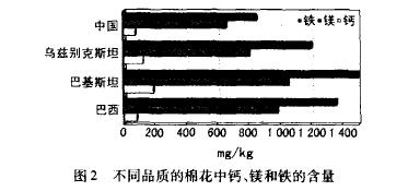 除所選擇的配方和工藝外,最終漂白結(jié)果很大程度上還取決于坯布的質(zhì)量、工藝用水以及基本化學(xué)品的質(zhì)量。在過氧化氫漂白過程中,如果不加以控制的話,坯布或工藝用水中的重金屬或鐵含量過高,會引起織物破損,從而導(dǎo)致白度不均勻,且重現(xiàn)性差。高堿土金屬濃度在漂白和隨后的工藝中會產(chǎn)生失穩(wěn)效應(yīng)。根據(jù)棉的不同原產(chǎn)國,重金屬和堿土金屬離子含量也有所不同(見圖2)。