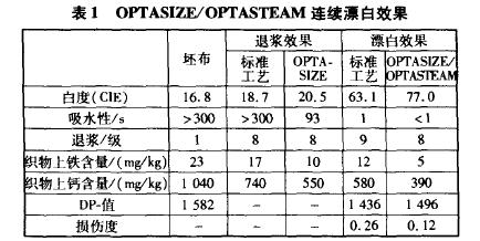 通過調(diào)節(jié)OPTASIZE/OPTASTEAM系統(tǒng),能夠?qū)崿F(xiàn)具有均衡的活化及穩(wěn)定平衡的最佳漂白效果。最終的漂白結(jié)果明顯比采用一般配方得好得多(表1)。為節(jié)約成本,不再進(jìn)行單獨脫礦質(zhì)處理,在這里可與退漿同步進(jìn)行。