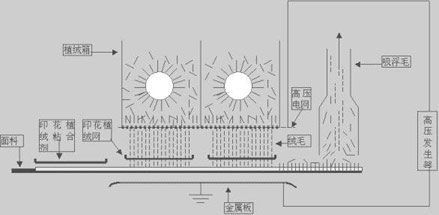 靜電植絨按電流方式分為交流靜電植絨和直流靜電植絨,在我國都采用交流靜電植絨。交流靜電植絨也稱為機(jī)械植絨。因?yàn)榻涣麟姰a(chǎn)生的電場只能起到讓絨毛在電力線方向定向分布的作用。在植入絨毛的同時(shí),產(chǎn)生了大量的浮毛,在每個(gè)植絨區(qū)域都在使用25-50%的浮毛植絨,這些浮毛不斷下落和返回到落毛箱中。而直流靜電植絨工藝使絨毛的喂入量很小。每個(gè)植絨區(qū)只提供需要植入量的絨毛,在電場的作用下植入粘合層中。這非常適合超細(xì)纖維的植絨,也符合現(xiàn)代化的生產(chǎn)標(biāo)準(zhǔn)。植絨方法見示意圖一: