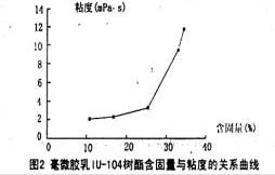 圖 2為 IU-104毫微膠乳樹脂的含固量與粘度的關(guān)系曲線。在規(guī)定的2-4 m Pa·s范圍內(nèi),含固量基本上在25%以下,隨著含固量繼續(xù)增加,粘度逐漸增大。含固量30%時(shí)為9 mPa·s,接近10 mPa·s的極限值,所以在噴墨墨水中控制含固量為 10%-20%,此時(shí)樹脂液的粒徑在100-500nrn,其中99%的粒徑小于500 nm。