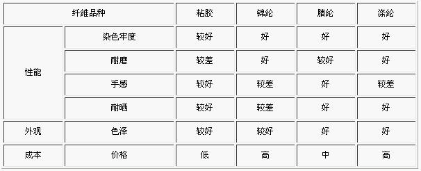 a.絨毛。種類:目前,用于植絨印花的纖維最為普遍的是粘膠、錦綸、晴綸、滌綸四種,如表4-10所列。