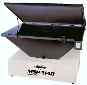 在我這次走訪之前,公司的生產(chǎn)部門使用單個曝光設(shè)備,平均每日生產(chǎn)50塊絲網(wǎng)版。而按我的建議改革實(shí)施之后,公司領(lǐng)導(dǎo)增購了一臺曝光設(shè)備,能在同一時間曝光尺寸在23×31” OD的絲網(wǎng)版。這臺曝光設(shè)備擁有兩個金屬鹵化物燈,其中一個就直接位于每一塊絲網(wǎng)版的下方。該設(shè)備由真空包裝殼體支撐,并配備有一個光能累積器。曝光射線可分割范圍從105秒到16秒不等,但如今已是同時在生產(chǎn)兩塊絲網(wǎng)版,而不僅僅是單獨(dú)一塊了。