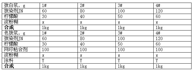3.6.1 拔染劑JN和檸檬酸一定要單獨化開。拔染劑JN用80C左右熱水溶解后加入漿中混勻;另外用冷水溶解檸檬酸再加入漿中;涂料和粘合劑則最后加。