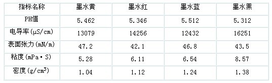 表1-3各色墨水的物理性能(測量溫度均為20℃)