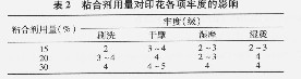 粘合劑用量過大,造成手感較硬、印制困難,易出現(xiàn)拖漿、堵網(wǎng)等疵病,并增加印制成本。本試驗采用不同用量的粘合劑,測定其對印花各項牢度的影響,結果見表2。