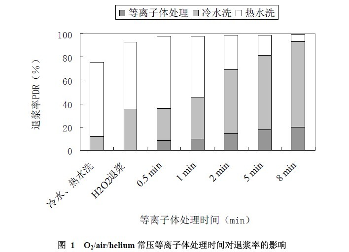 為了比較分析等離子體對(duì)PVA 漿料的作用情況,將H2O2 退漿(包括2 次冷水和熱水洗滌)和經(jīng)O2/air/helium 常壓等離子體處理不同時(shí)間的退漿率列于圖1 中。