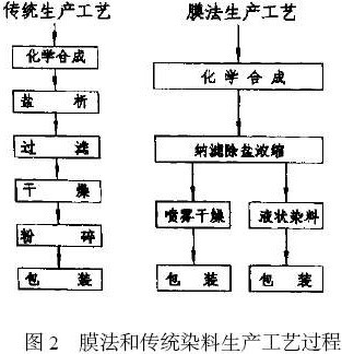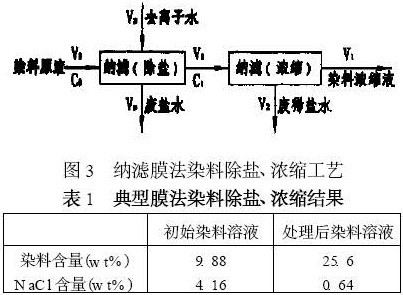 【集萃網觀察】染料是印染工業(yè)不可缺少的原料, 在目前常用的染料生產工藝中, 化學合成的染料經鹽析、過濾、干燥后制成固體染料。整個生產過程不僅產生大量的難處理廢水, 而且所生產的染料的鹽含量高、純度低, 影響印染工藝的染色質量。 用納濾膜分離技術對染料生產工藝進行改進,開發(fā)清潔生產工藝, 降低染料的鹽含量, 提高染料的純度和品質, 同時還可生產高質量的液狀染料, 減少廢水排放量, 對整個染料工業(yè)的可持續(xù)發(fā)展是十分必要的。圖2 給出了傳統(tǒng)染料生產工藝流程和膜法改進的染料生產工藝流程。 膜法和傳統(tǒng)染料生產工藝過程納濾膜技術為一壓力驅動膜分離過程, 其孔徑為數個納米級, 可有效實現對分子量數百級的物質與無機鹽、小分子物質和水的分離。用納濾膜技術處理染料合成水溶液, 在對染料進行除鹽凈化的同時,對染料進行濃縮。濃縮后的染料溶液可直接制成液體染料產品, 也可經噴霧干燥后制成固體粉狀染料產品。整個納濾過程可分為恒容除鹽和濃縮兩部分,據產品最終要求的純度和濃度, 確定恒容除鹽的程度和脫水濃縮的倍數。具體的工藝如圖3 所示。表1 列出了膜法染料除鹽、濃縮的典型處理結果。